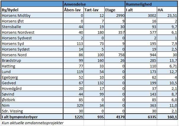 Opgørelsen omfatter ubebyggede arealer i rammeområder, der er udlagt til boliger og til centerformål, og hvor der ikke er aktuelle byggesager. Opgørelsen omfatter også omdannelses- og fortætningspotentialer, der forventes at komme i spil inden for en 12 års periode (planperioden).
