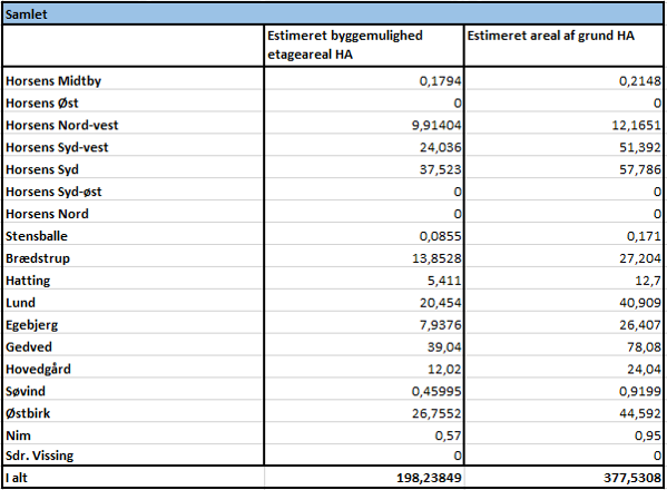 I beregningen for restrummelighed, har vi vurderet, at kun tomme matrikler og let bebyggede matrikler udgør et restareal. Dette af hensyn til, at det vurderes usandsynligt, at de enkelte erhvervsvirksomheder vil benytte sig af den fulde byggeret inden for den enkelte matrikel. Denne vurdering er fortaget på baggrund af et dataudtræk over de typiske erhvervstyper, som findes i Horsens Kommune. Udtrækket viser, at der opføres en stor andel erhverv til lager, transport og logistik med et stort bebygget areal - uden det nødvendigvis resulterer i en høj bebyggelsesprocent. Etagearealet er som udgangspunkt angivet, som oplyst i BBR. Der er medtaget areal fra enkelte byggerier, hvor der allerede er ansøgt om byggetilladelse.